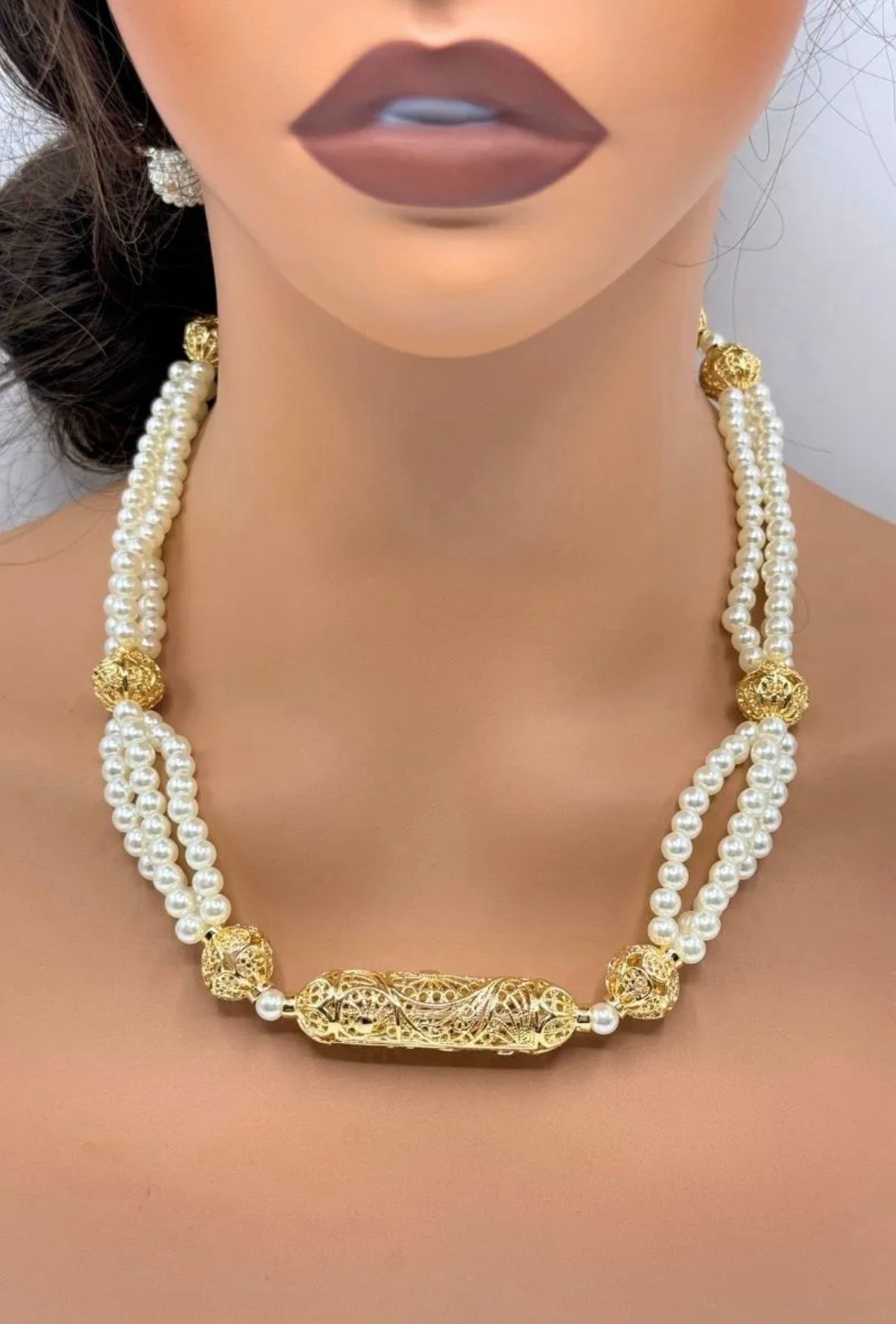 Collier à deux rangées de perles blanches nacrées Perles et éléments dorés filigranés Design élégant et intemporel Convient pour mariages, fêtes et grandes occasions