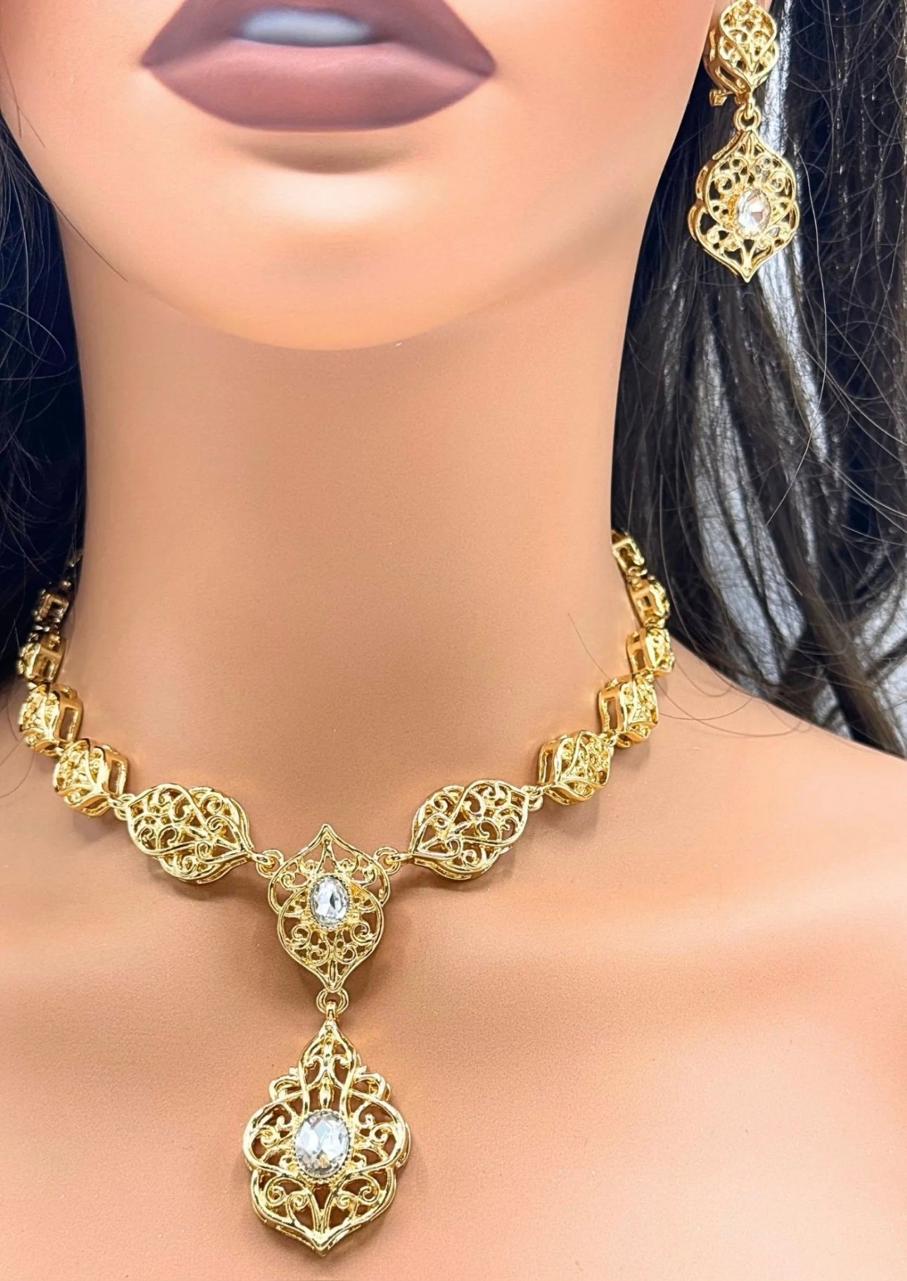 Parure assertie de strass , composé d’un collier , de boucles d’oreilles, d’un bracelet et d’une bague