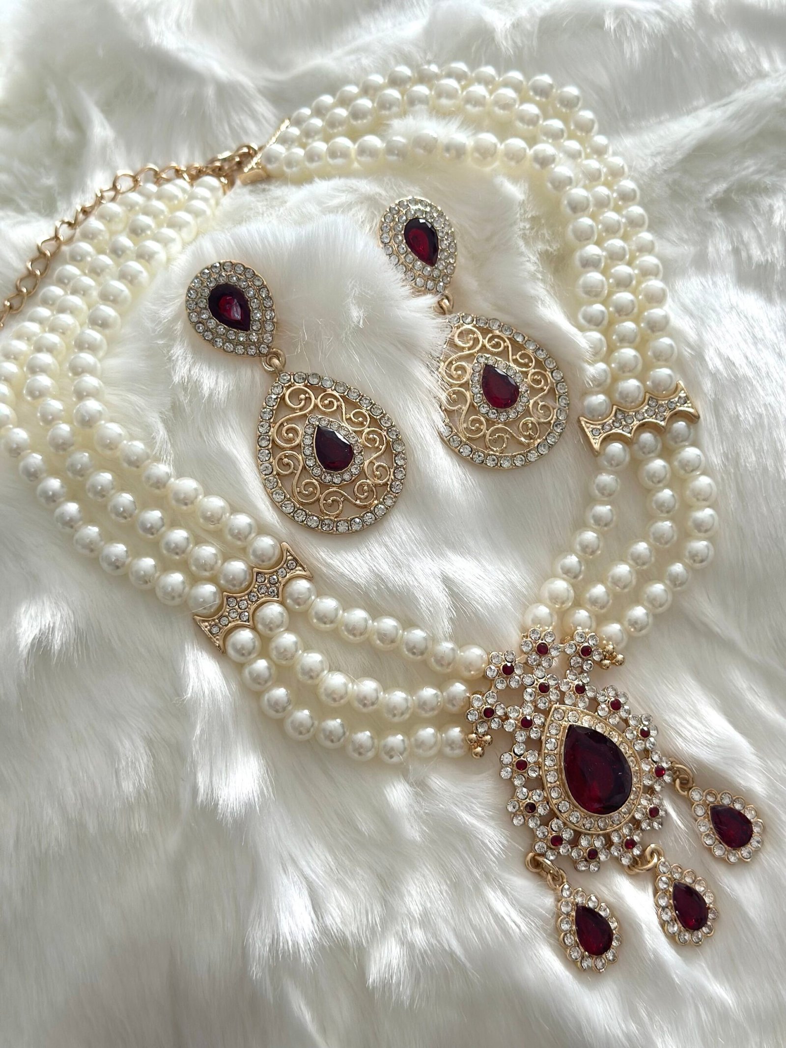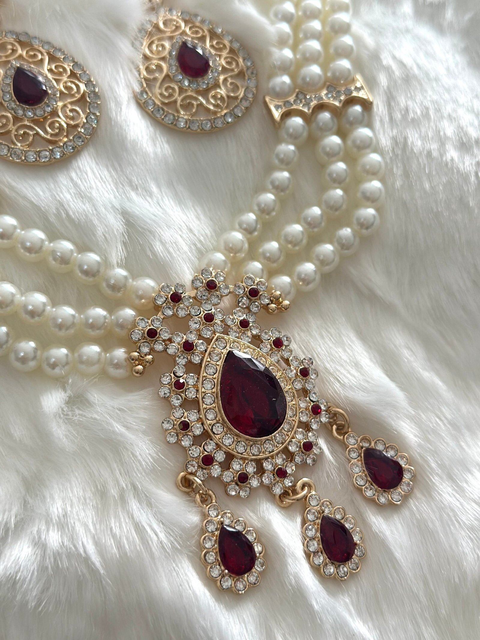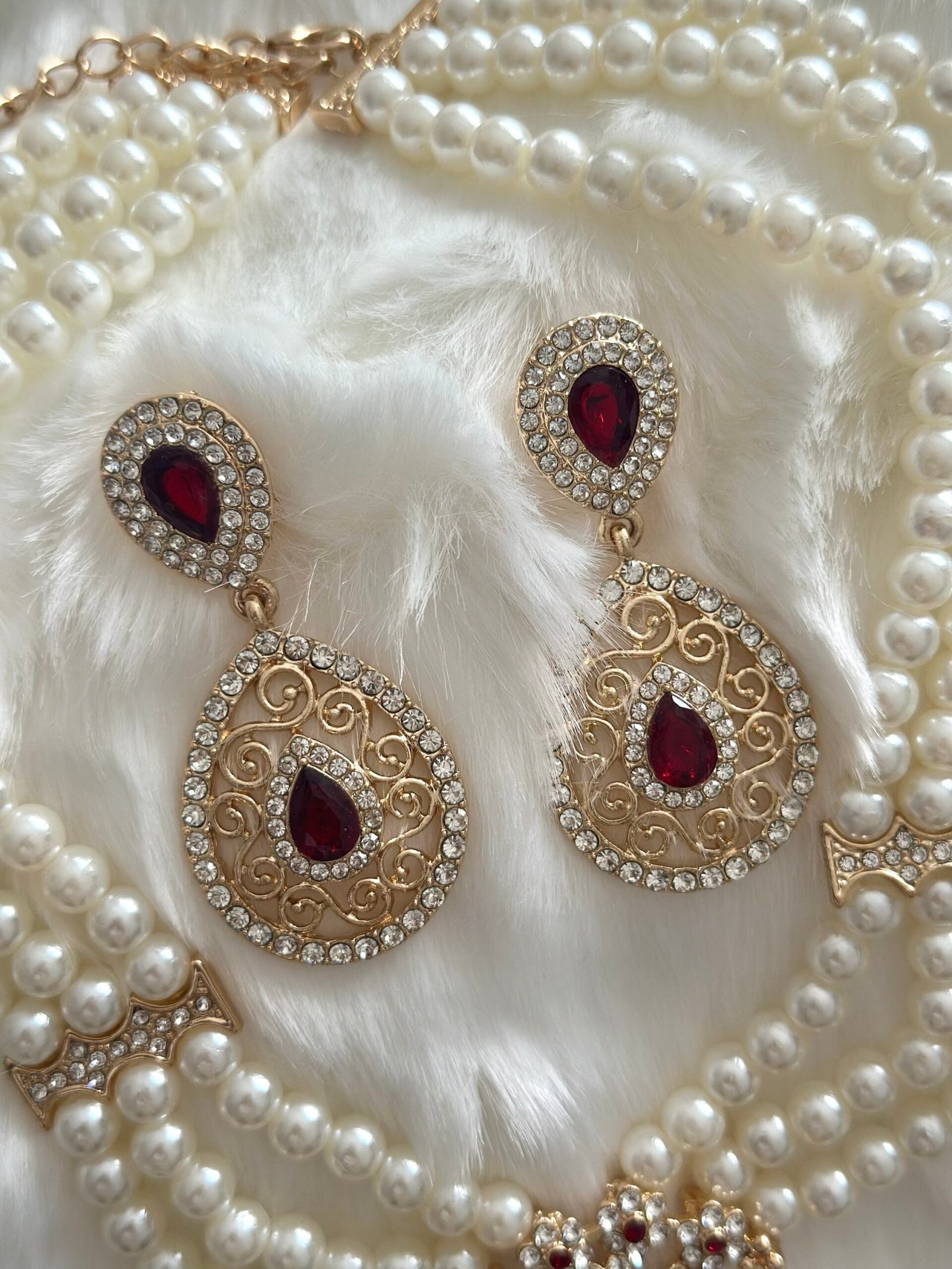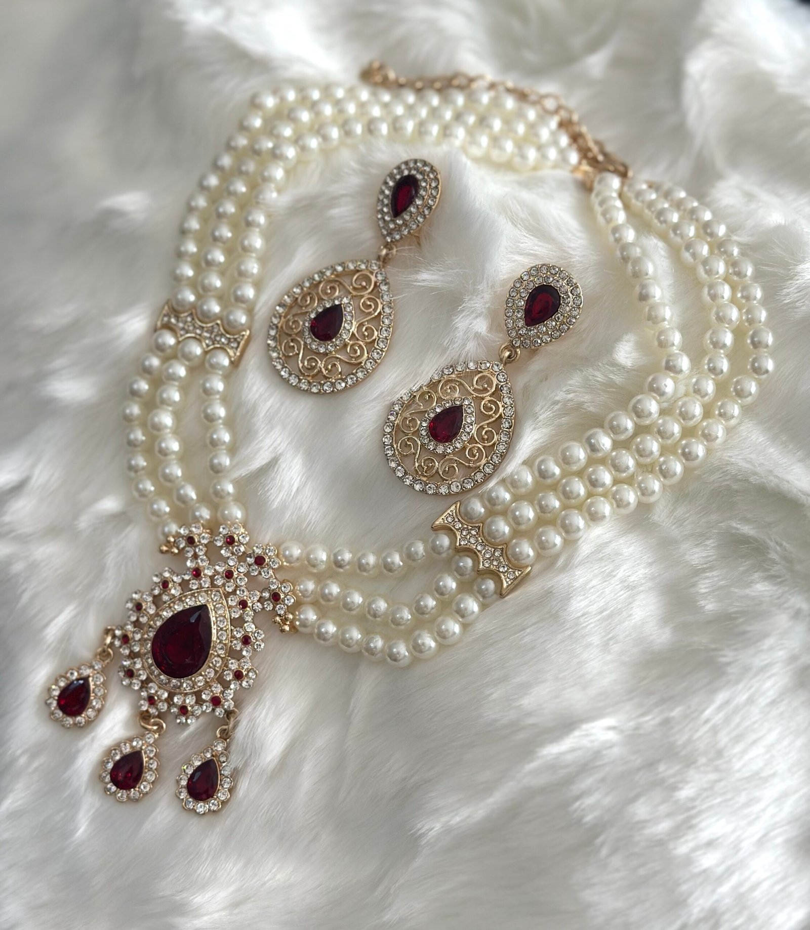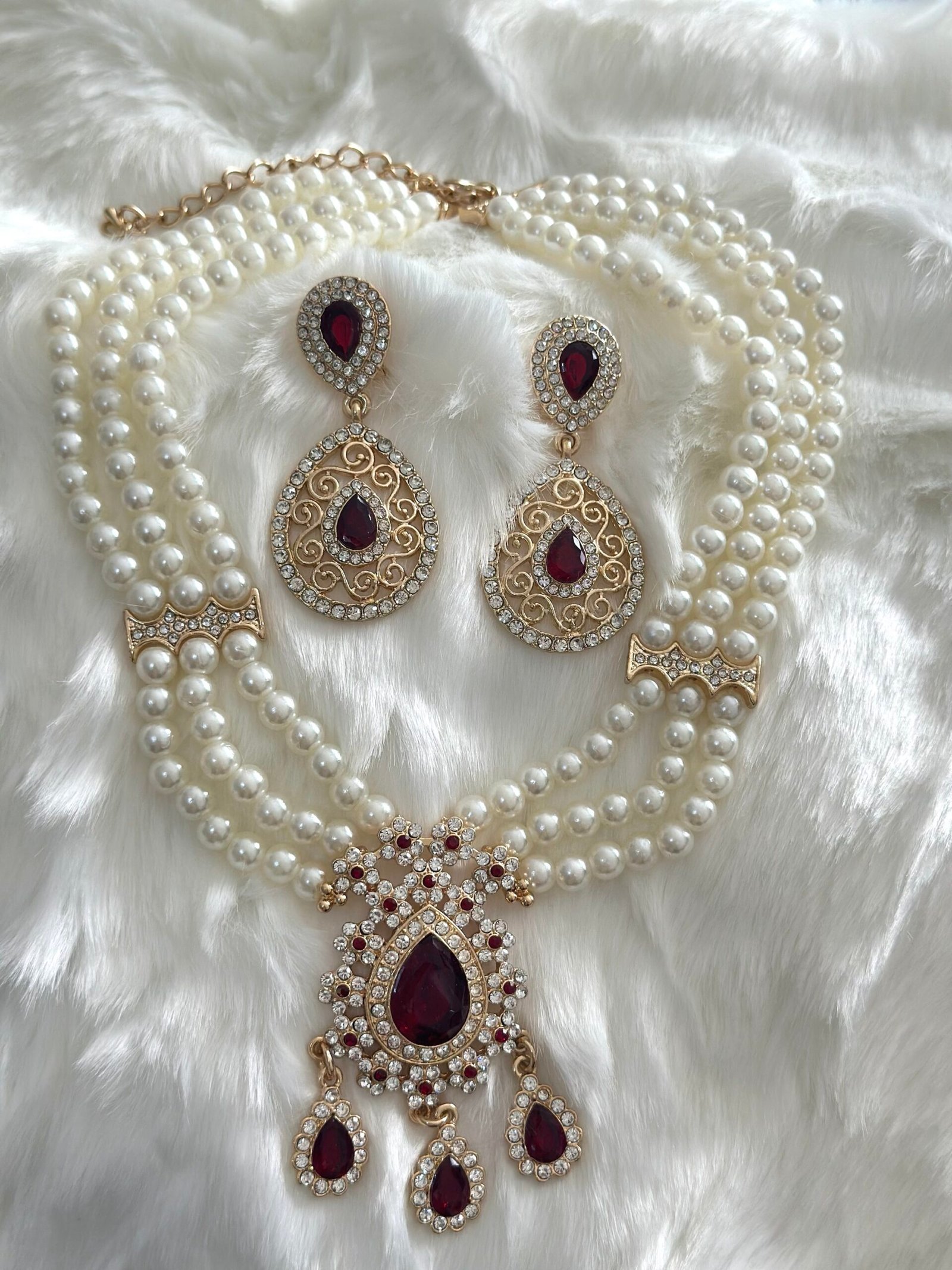 Parure assertie de strass et de perle , composé d’un collier et de boucles d’oreilles. Le collier a une chainette qui permet de régler à sa convenance la longueur